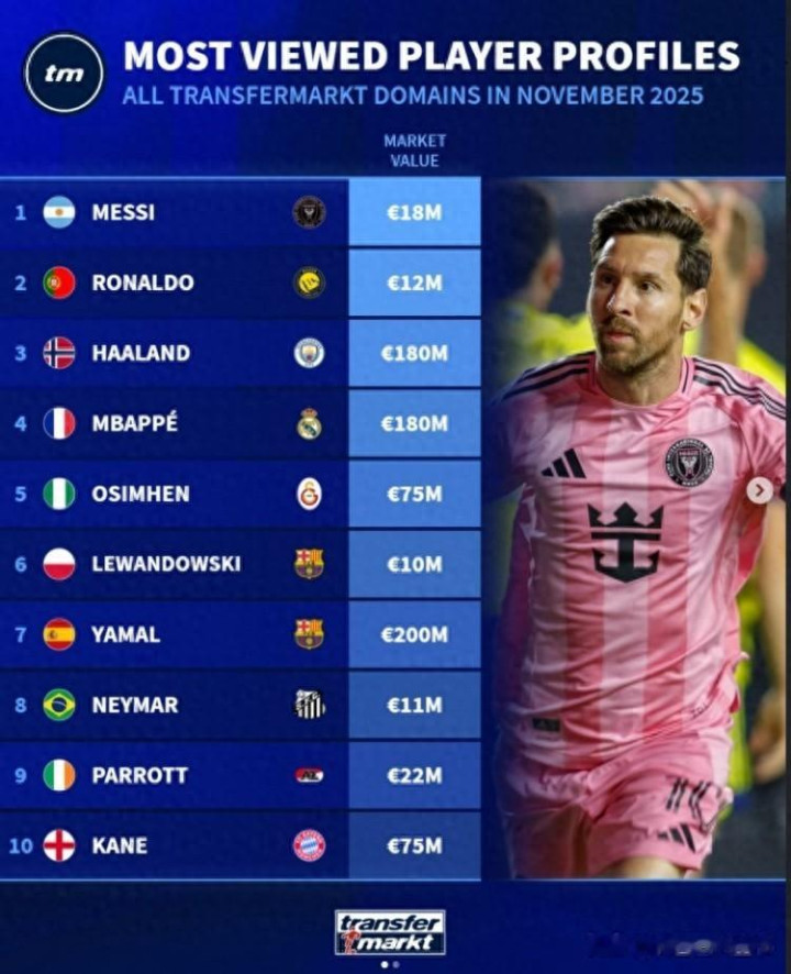 12月10日。德国《转会市场》网站在12月份公布了他们官方11月的球员页面浏览量排行榜,其中梅西第一,C罗第二,哈兰德和姆巴佩第三和第四。当梅西排名第一时,舆论并未指责其所谓“网红”,但当C罗排名第一时,这样的嘲讽会接踵而至。这不是双标,而是他们两个人平时作为的集中体现。这种分野揭示了一个超越排名的深层逻辑:在数字时代,流量本身已是中性,但其背后的“含金量”与“成因”,才决定了它是王冠上的宝石,还是橱窗里的标签。